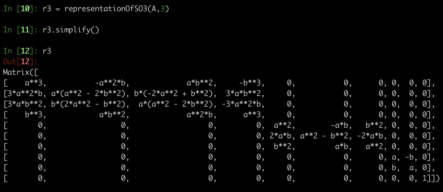 The degree $2$ representation computed here looks a bit different than the one computed earlier at the end of the preliminaries section because the bases are slightly different; otherwise it is correct. The code I wrote can generate the matrix representation $\rho_d$ for any degree $d$. For instance $d=3$